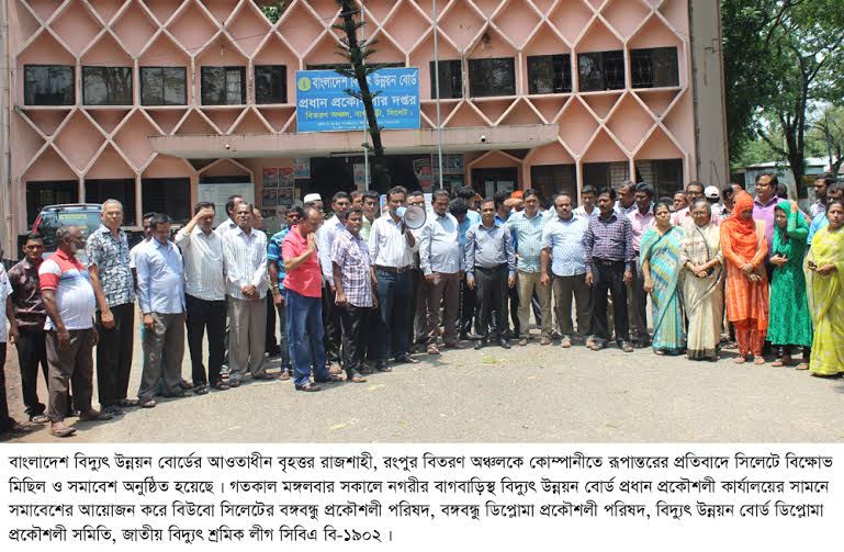 বাংলাদেশ বিদ্যুৎ উন্নয়ন বোর্ডের আওতাধীন বৃহত্তর রাজশাহী, রংপুর বিতরণ অঞ্চলকে কোম্পানীতে রূপান্তরের প্রতিবাদে সিলেটে বিক্ষোভ মিছিল ও সমাবেশ অনুষ্ঠিত হয়েছে।