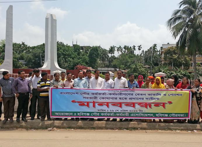বাংলাদেশ পৌরকর্মকর্তা-কর্মচারী এসোসিয়েশনের কেন্দ্রীয় কর্মসুচীর অংশ হিসেবে পালিত এ মানববন্ধনে বক্তারা পৌরকর্মকর্তা-কর্মচারীদের বেতন-ভাতা ও পেনশন সরকারী কোষাগার হতে প্রদানের দাবীর স্বপক্ষে যুক্তি তুলে ধরেন। এছাড়াও কর্মকর্তা-কর্মচারীদের সাথে সংহতি প্রকাশ করে বক্তব্য রাখেন হবিগঞ্জ পৌরসভার ভারপ্রাপ্ত মেয়র দীলিপ দাস।