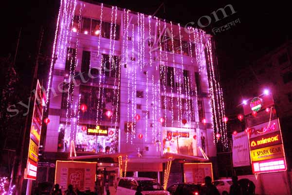 অলিতে-গলিতে থাকা শো-রুমেও ক্রেতা আকৃষ্ট করতে আলোকসজ্জা দেখা গেছে। জিন্দাবাজারের সিলেট প্লাজা, লতিফ সেন্টার, সিলেট মিলেনিয়াম মার্কেট, কুমারপাড়া দেশীদশ, বারুতখানা করিম টাওয়ার, সিলকো টাওয়ারসহ বিভিন্ন শপিং কমপে¬ক্সে গিয়ে বাহারি আলোকসজ্জা দেখা গেছে। মার্কেটের আগাগোড়া মোড়ানো হয়েছে বর্ণিল লাইট দিয়ে।