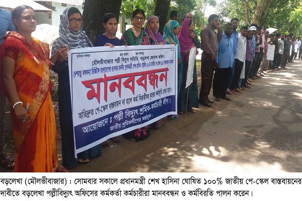 মৌলভীবাজারের বড়লেখায় প্রধানমন্ত্রী শেখ হাসিনা ঘোষিত ১০০% জাতীয় পে-স্কেল বাস্তবায়নের দাবীতে পল্লীবিদ্যুৎ অফিসের কর্মকর্তা-কর্মচারীরা মানববন্ধন ও কর্মবিরতি পালন করেন।