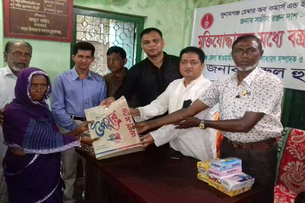 সুনামগঞ্জ চেম্বার অব কমার্সের ভাইস প্রেসিডেন্ট ও বিশিষ্ট ব্যবসায়ী সজীব রঞ্জন দাশের উদ্যোগে জেলার বিভিন্ন এলাকার মুক্তিযোদ্ধাদের মধ্যে এই ঈদবস্ত্র বিতরণ করা হয়।