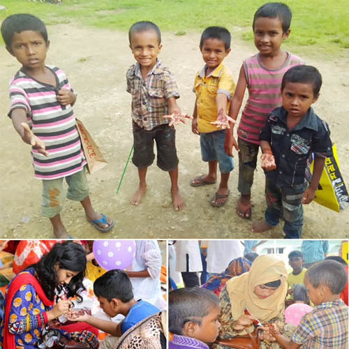 হবিগঞ্জে তারুণ্য সোসাইটির উদ্যোগে পবিত্র ঈদ-উল-ফিতর উপলক্ষে শিশুদের জন্য মেহেদী উৎসব ও ঈদ বস্ত্র বিতরণ অনুষ্ঠানে দেখা গেল এই দৃশ্যটি ।