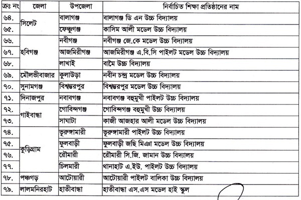 বি-বাড়ীয়ার নবীনগর পাইলট উচ্চ বিদ্যালয় ও আশুগঞ্জ হাজী আব্দুল জলিল উচ্চ বিদ্যালয়। রাজশাহীর পবার নওহাটা উচ্চ বিদ্যালয়। নাটোরের বাগাতিপাড়া পাইলট মডেল উচ্চ বিদ্যালয়, গুরুদাসপুর পাইলট মডেল উচ্চ বিদ্যালয়, ও নলডাঙ্গা উচ্চ বিদ্যালয়। নওগাঁর আহসান উল্লাহ মেমরিয়াল মডেল উচ্চ বিদ্যালয় ও বদলগাছি মডেল পাইলট হাইস্কুল।