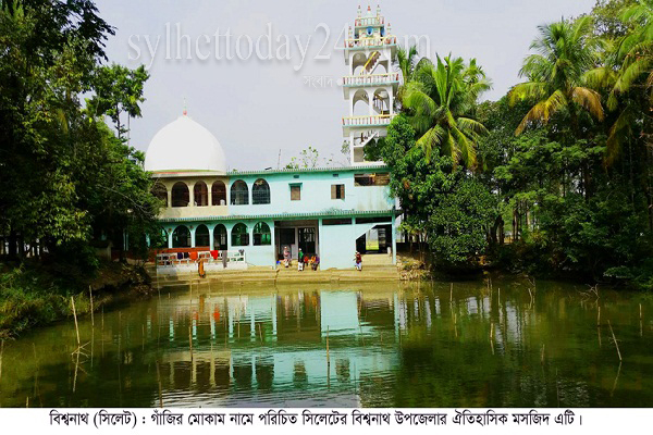 গাজীর মোকামের ইতিহাস: মসজিদটি কতসালে নির্মাণ করা হয়েছিল তা স্পষ্টভাবে স্থানীয়দের যেমন জানানেই তেমনি কে গাজী সাহেব তা-ও কারো জানানেই। তবে জনশ্রুতি আছে, প্রায় ৫শ’ বছর আগে বাঘের পিঁঠে চড়ে গাঁজি সাহেব বিশ্বনাথের আমতৈল গ্রামের গভীর জঙ্গলে প্রায়ই বিশ্রাম নিতেন। জঙ্গলের পাশেই বর্তমান জমসেরপুর গ্রামের হাজী ফনা মির্জা নামের দরিদ্র এক মুসল্লি বসবাস করতেন। পরপর তিনদিন স্বপ্নে দেখেন গাঁজি সাহেব তাকে ডেকে বলছেন পাশের ওই জঙ্গলের মোকামটির হেফাজত করো। ফনা মির্জা তখন ঝুঁপের ভিতর গিয়ে জঙ্গল পরিষ্কার করে গোলাকার একটি অংশ দেখতে পান। পরবর্তীতে অলৌকিকভাবে আসা নির্মাণ সামগ্রী দিয়েই সেখানে এক গম্ভুজ বিশিষ্ট ছোট একটি মসজিদ নির্মাণ করেন। যেখানে সর্বোচ্চ ৫০জন মুসল্লি একসঙ্গে নামাজ আদায়করতে পারেন। বাঘ-ভাল্লুকের জঙ্গলে মসজিদ নির্মানের ফলে ফনা মির্জা ওই এলাকায় ফনা গাজী হিসেবে সু-পরিচিতি লাভ করেন।