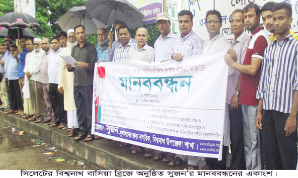 জঙ্গিবাদ প্রতিরোধ ও শান্তি শৃঙ্খলা প্রতিষ্ঠায় গণতান্ত্রিক শক্তির জাতীয় ঐক্যের লক্ষে মানববন্ধন কর্মসূচি পালন করেছে সুশাসনের জন্য নাগরিক (সুজন) সিলেটের বিশ্বনাথ উপজেলা শাখা। শনিবার সকাল সাড়ে ১০টা থেকে সাড়ে ১১টা পর্যন্ত স্থানীয় বাসিয়া ব্রীজে অনুষ্ঠিত ওই মানববন্ধন কর্মসূচিতে বিভিন্ন সামাজিক সংগঠনের নেতৃবৃন্দ অংশ নেন।