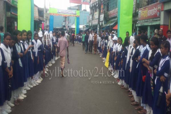 শনিবার বেলা ১১টা থেকে ১টা পর্যন্ত উপজেলার দিরাই উচ্চ বিদ্যালয় ও বালিকা উচ্চ বিদ্যালয়ের প্রায় সাড়ে পাঁচশ শিক্ষার্থী শহরের থানা চত্বরের সামনে সড়কে দাঁড়িয়ে থাকে।