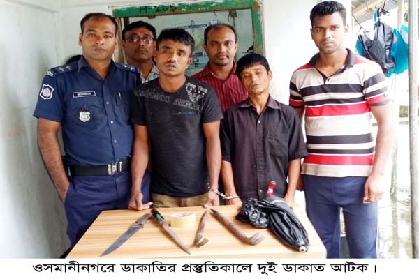 পুলিশ সূত্রে জানা যায়, সোমবার দিন গত রাত আড়াই টার দিকে উপজেলার দয়ামীর-গহড়পুর সড়কের রাইকদাড়া নামক স্থানে ১০/১২ জনের এক দল ডাকাত ডাকাতির প্রস্তুতি খবর পেয়ে ওসমানীনগর থানার ওসি আব্দুল আউয়াল চৌধুরীর নেতৃত্বে একদল পুলিশ অভিযান চালায়। পুলিশের উপস্থিতি টের পেয়ে ডাকাতরা পালানোর চেষ্টাকালে ডাকাত আব্দুল্লাহ ও ছমির কে আটক করে পুলিশ। এসময় অন্য ডাকাতরা পালিয়ে যায়।