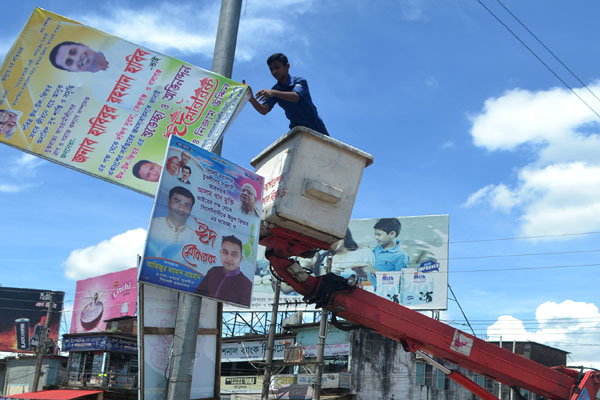 মহানগরীকে পরিচ্ছন্ন করার লক্ষ্যে মঙ্গলবার (২৬ জুলাই) থেকে ব্যানার, ফেস্টুন ও প্ল্যাকার্ড অপসারণ অভিযান শুরু করেছে সিলেট সিটি কর্পোরেশন। দুইদিনে সিলেট মহানগরীর এলাকায় প্রায় সাড়ে ১২শ ব্যানার, ফেস্টুন ও প্ল্যাকার্ড অপসারণ করা হয়েছে।
