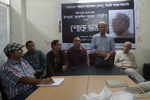 বাংলাদেশ পরিবেশ আন্দোলন (বাপা) সিলেট শাখার সহ-সভাপতি অ্যাডভোকেট এমাদ উল্লাহ শহীদুল ইসলামের সভাপতিত্বে শোক সভার শুরুতে প্রয়াত শিক্ষাবিদের আত্মার শান্তি কামনা করে এক মিনিটের নিরবতা পালন করা হয় । সভায় স্বাগত বক্তব্য রাখেন সাধারণ সম্পাদক আবদুল করিম কিম । মরহুমের জীবন ও কর্মের বিভিন্ন দিক তুলে ধরে শোকসভায় অন্যান্যের মধ্যে বক্তব্য রাখেন বীর মুক্তিযোদ্ধা বিশিষ্ট আইনজীবী মুজিবুর রহমান চৌধুরী, ওভারসিজ সিলেটের নির্বাহী কর্মকর্তা শামসুল আলম, মেট্রোপলিটন ইউনিভার্সিটির ডেপুটি রেজিস্ট্রার মিহিরকান্তি চৌধুরী, প্রয়াত ছদরুদ্দিন আহমদ চৌধুরীর জামাতা অঙ্গিকার বাংলাদেশের পরিচালক অ্যাডভোকেট মঈনুদ্দীন আহমদ জালাল, চট্টগ্রাম বিশ্ববিদ্যালয়ের ইংরেজি বিভাগের সহকারী অধ্যাপক বিশিষ্ট অনুবাদক গোলাম হোসেন হাবিব (জিএইচ হাবীব), সোদি আরবের কিং খালিদ ইউনিভার্সিটির সহকারী অধ্যাপক কাজী সাইফুল আসপিয়া, শাহজালাল বিজ্ঞান ও প্রযুক্তি বিশ্ববিদ্যালয়ের সহকারী অধ্যাপক সরকার সোহেল রানা, তথ্যচিত্র নির্মাতা নিরঞ্জন দে যাদু, সিলেট বিভাগীয় স্টেডিয়ামের ভেনু ম্যানেজার জয়দ্বীপ দাস সুজক, দৈনিক সবুজ সিলেটের বার্তা সম্পাদক ছামির মাহমুদ, আইনজীবী গোলাম সোবহান চৌধুরী, পরিবেশবাদী সংগঠন ভূমি সন্তানের সমন্বয়ক আশরাফুল কবীর, সিলেট কৃষি বিশ্ববিদ্যালয়ের প্রাণী অধিকার বিষয়ক সংগঠন প্রাধিকার-এর সভাপতি মঞ্জুর কাদের চৌধুরী প্রমুখ।