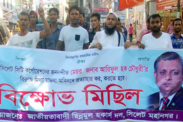 সিলেট মহানগর ছিন্নমূল হকার্স দলের উদ্যোগে সিলেট সিটি কর্পোরেশনের (সাময়িক বরখাস্ত) মেয়র আরিফুল হক চৌধুরীর বিরুদ্ধে দায়েরকৃত সকল মিথ্যা ও ষড়যন্ত্র মূলক মামলা প্রত্যাহার ও অবিলম্বে মুক্তির দাবীতে বিক্ষোভ মিছিল ও সমাবেশ অনুষ্ঠিত হয়েছে।