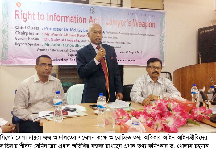 শনিবার (৬ আগস্ট) দুপুরে সিলেট জেলা দায়রা জজ আদালতের সম্মেলন কক্ষে আয়োজিত তথ্য অধিকার আইন, আইনজীবীদের হাতিয়ার শীর্ষক সেমিনারের প্রধান অতিথির বক্তব্যে প্রধান তথ্য কমিশনার ড. গোলাম রহমান এসব কথা বলেন।