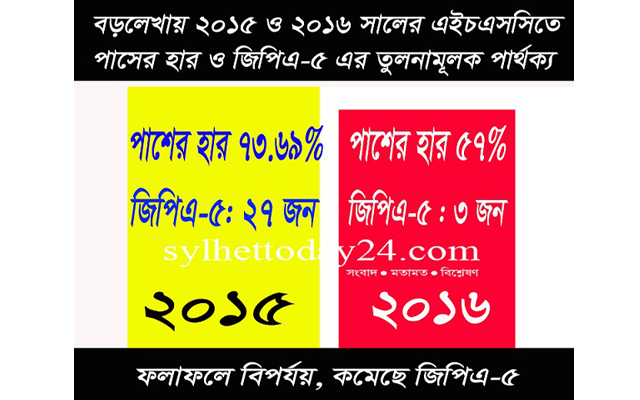 বড়লেখায় ২০১৫ ও ২০১৬ সালের এইচএসসি পরীক্ষায় পাশের হার ও জিপিএ-৫ এর তুলনামূলক পার্থক্যে দেখা গেছে, ২০১৫ সালে এ উপজেলায় ১৭৫২ জন পরীক্ষায় অংশ নিয়ে পাস করেছিলো ১২৯১ জন। পাশের হার ছিল ৭৩.৬৯%। ২টি কলেজ থেকে জিপিএ-৫ পেয়েছিলেন ২৭ জন শিক্ষার্থী। এর মধ্যে নারী শিক্ষা একাডেমী ডিগ্রি কলেজ পেয়েছিল ১০টি জিপিএ-৫ ও ১৭টি জিপিএ-৫ পেয়ে উপজেলায় শীর্ষে ছিল সদ্য জাতীয়করণ হওয়া বড়লেখা ডিগ্রি কলেজ।
