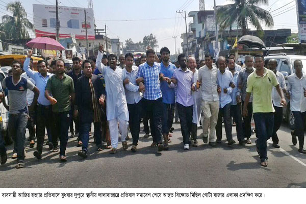 লালাবাজারের ব্যবসায়ী আজির উদ্দিন হত্যাকারীদের গ্রেফতার ও দৃষ্টান্তমূলক শাস্তির দাবিতে লালাবাজার, তেতলি, সিলাম ও অলঙ্কারী ইউনিয়নের যৌথ সমন্বয়ে প্রতিবাদ সভা ও বিক্ষোভ মিছিল বুধবার দুপুরে স্থানীয় পশ্চিম লালাবাজারে অনুষ্ঠিত হয়।