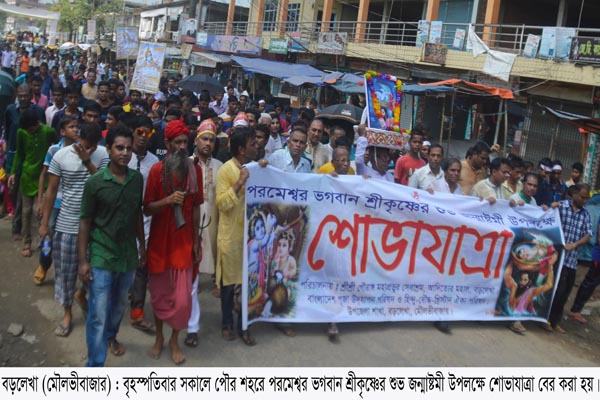 মৌলভীবাজারের বড়লেখায় নানা আয়োজনের মধ্য দিয়ে পরমেশ্বর ভগবান শ্রীকৃষ্ণের জন্মাষ্টমী উদ্যাপিত হয়েছে। এ উপলক্ষে বৃহস্পতিবার সকালে স্থানীয় আদিত্যের মহাল শ্রী শ্রী গৌরাঙ্গ মহাপ্রভুর সেবাশ্রম, বাংলাদেশ পূজা উদ্যাপন পরিষদ ও হিন্দু-বৌদ্ধ-খ্রিস্টান ঐক্য পরিষদ বড়লেখা উপজেলা শাখার উদ্যোগে শোভাযাত্রা বের করা হয়।