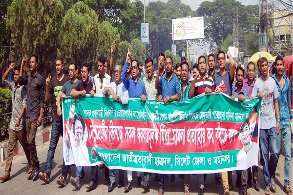 বিএনপির চেয়ারপার্সন বেগম খালেদা জিয়ার বিরুদ্ধে গ্রেফতারী পরোয়ানা জারির প্রতিবাদে কেন্দ্রীয় কর্মসূচির অংশ হিসাবে বৃহস্পতিবার (২৫ আগস্ট) বেলা ২ টায় সিলেট জেলা ও মহানগর ছাত্রদলের উদ্যোগে বিক্ষোভ মিছিল ও সমাবেশ অনুষ্ঠিত হয়।