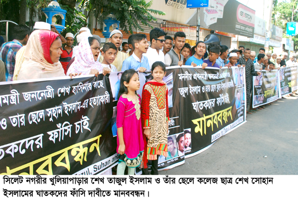 সিলেট নগরীর খুলিয়াপাড়ার শেখ তাজুল ইসলাম ও তাঁর ছেলে কলেজছাত্র শেখ সোহান ইসলামের খুনীদের ফাঁসি দাবিতে মানববন্ধন করেছেন এলাকাবাসী। শুক্রবার বাদ জুম’আ নগরীর শেখঘাট গরম দেওয়ান মাজারে সামনে এ মানববন্ধন করা হয়।