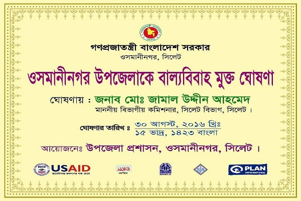 মঙ্গলবার সকাল ১১টায় ওসমানীনগর থানা প্রাঙ্গণে উপজেলা প্রশাসনের উদ্যোগে আয়োজিত অনুষ্ঠানে প্রধান অতিথি হিসেবে উপস্থিত থেকে আনুষ্ঠানিকভাবে ওসমানীনগর উপজেলাকে বাল্যবিবাহ মুক্ত উপজেলা ঘোষণা করবেন সিলেটের বিভাগীয় কমিশনার মো জামাল উদ্দিন আহমেদ।