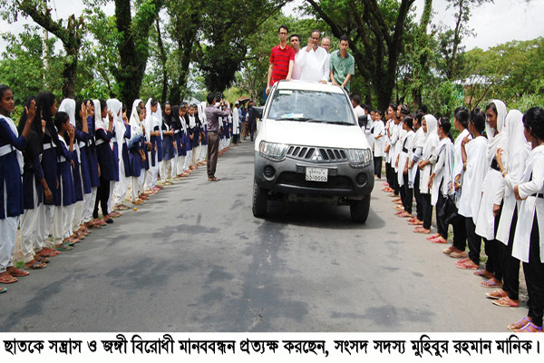 সিলেট-সুনামগঞ্জ সড়কের সন্ত্রাস ও জঙ্গীবিরোধী ২০ কিলোমিটার মানববন্ধনে অংশ নিয়েছে উপজেলার স্কুল-কলেজ ও মাদ্রাসার শিক্ষার্থীরা। মুহিবুর রহমান মানিক এমপি’র আহ্বানে এবং উপজেলা পরিষদ, প্রশাসন ও স্থানীয় আ.লীগের উদ্যোগে এ মানববন্ধন অনুষ্ঠিত হলেও দলীয় নেতা-কর্মী ও সমর্থকদের মানববন্ধনে অংশ নিতে তেমন দেখা যায়নি।