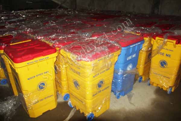 পলিথিনে মোড়ানো প্লাস্টিকের তৈরি এসব ডাস্টবিন চুরি হওয়া ঠেকাতে লাগানো হয়েছে লোহার শেকল।