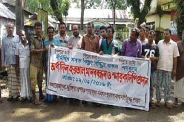 স্থানীয় শহীদ মিনার প্রাঙ্গণে মানববন্ধনে বক্তারা বলেন, কিছু দিন পূর্বে আমরা ৩০ হাজার টাকা দিয়েছি আর.ই সাহেবকে আমাদের ট্রান্সফরমারটি পরিবর্তন করার জন্য। উক্ত টাকা দেয়া হয়েছে আর.ই সাহেবের আস্থাভাজন লোক আঙ্গুর মিয়ার মাধ্যমে। কিন্তু ২-৪ দিন যেতে না যেতেই ফের বিকল হয়ে পড়েছে সেই ট্রান্সফরমারটি। আজ ১৫ দিন যাবত আমরা রয়েছি অন্ধকারে। এ ব্যাপারে বার বার আর.ই সাহেবের নিকট ধরনা দিয়ে কোন সুফল পাচ্ছি না।