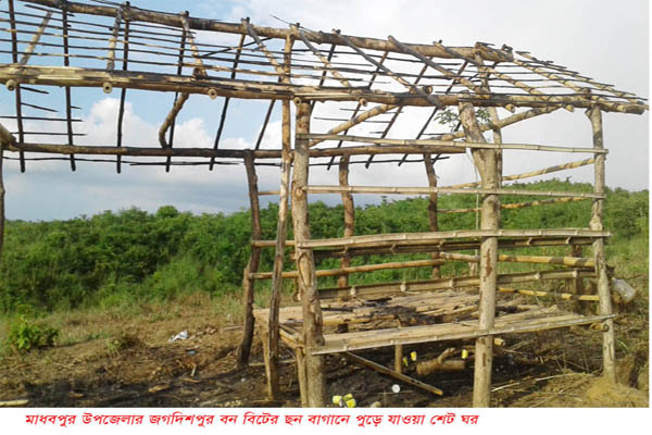 হবিগঞ্জের মাধবপুর উপজেলার জগদিশপুর বন বিটে আগুনে পাহাড়াদারদে শেট ঘর পুড়ে গেছে। এছাড়া ছন বাগানে লাগানো কলা গাছের চারা ও সবজি জমি নষ্ট করা হয়েছে।