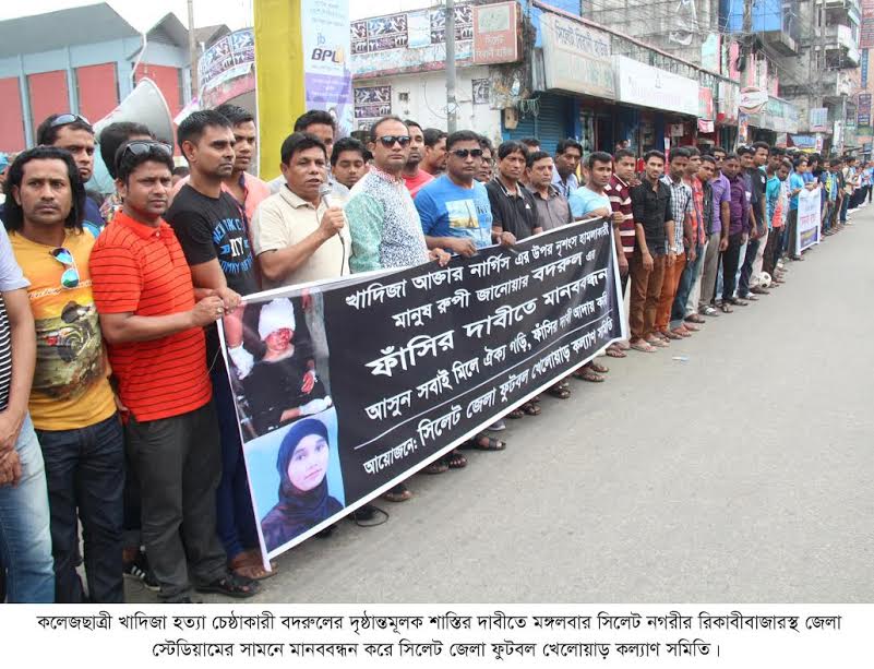 সিলেট সরকারি মহিলা কলেজের স্নাতক (পাস) দ্বিতীয় বর্ষের শিক্ষার্থী খাদিজা বেগম নার্গিসকে কোপানোর ঘটনায় ছাত্রলীগ নেতা বদরুলের সর্বোচ্চ শাস্তির দাবিতে মানববন্ধন করেছে সিলেট জেলা ফুটবল খেলোয়াড় কল্যাণ সংস্থা।