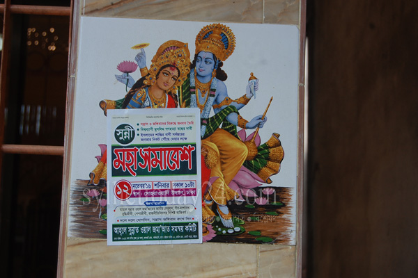 বৃহস্পতিবার সকালে ঘুম থেকে ওঠে মন্দিরের আরেক সেবায়েত আমার বড় ভাই প্রতেশ রায় মন্দিরের দেয়ালে টাইলাস দিয়ে লাগানো রাধা-কৃষ্ণের ছবির উপর সুন্নী মহাসমাবেশের পোস্টার সাঁটানো দেখতে পান।