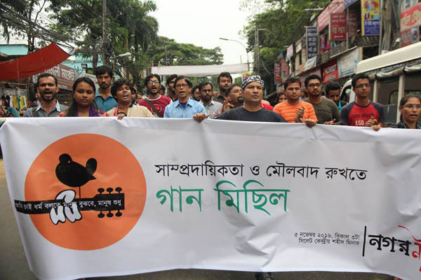 গানে গানে দেশজুড়ে সাম্প্রদায়িক হামলার প্রতিবাদ জানালো সিলেটের নাট্য সংগঠন নগরনাট। শনিবার বেকেলে ঢোল-হারমোনিয়াম নিয়ে গান গেয়ে নগরীর বিভিন্ন সড়ক প্রদক্ষিণ করে নগরনাটের সদস্যরা। তাদের সাথে একাত্মতা পোষণ করেন কণ্ঠ মেলান আরো বিভিন্ন ব্যক্তি ও প্রতিষ্ঠান।