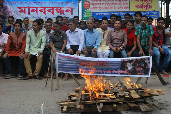 শুক্রবার দুপুরে সিলেট কেন্দ্রীয় শহীদ মিনারের সামনে চিতা জ্বালিয়ে অবস্থান কর্মসূচী পালন করে তারা।