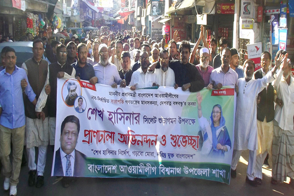আওয়ামী লীগ সভানেত্রী প্রধানমন্ত্রী শেখ হাসিনার সিলেট আগমনকে স্বাগত জানিয়ে সিলেটের বিশ্বনাথে আনোয়ারুজ্জামান বলয়ের (আ’লীগ একাংশ) নেতারা প্রচার মিছিল করেছেন।