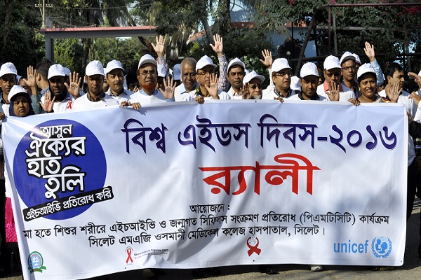 বিশ্ব এইডস দিবস ২০১৬ উদযাপন উপলক্ষে সিলেট এমএজি ওসমানী মেডিকেল কলেজ হাসপাতালে পিএমটিসিটি প্রকল্পের উদ্যোগে ১লা ডিসেম্বর (বৃহস্পতিবার) বিভিন্ন কর্মসূচী পালন করা হয়। দিনের শুরুতে ইউনিসেফ এর সহায়তায় সিওমেক হাসপাতালে বাস্তবায়িত ‘মা হতে শিশুর শরীরে এইচআইভি ও জন্মগত সিফিলিস প্রতিরোধ কার্যক্রম (পিএমটিসিটি) ও আশার আলো সোসাইটি, সিলেটের আয়োজনে হাসপাতালে এক বর্ণাঢ্য র্যালীর আয়োজন করা হয়। র্যালীতে অংশ গ্রহণকারীরা নিজেদের হাতে বিভিন্ন বার্তা লিখে এবারের প্রতিপাদ্য বিষয় ” আসুন ঐক্যের হাত তুলি, এইচআইভি প্রতিরোধ করি” এর প্রতি একাত্মতা প্রকাশ করেন।