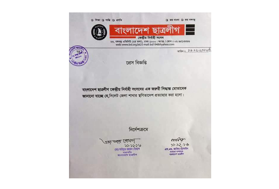 সিলেট জেলা ছাত্রলীগের কমিটির স্থগিতাদেশ প্রত্যাহার করেছে কেন্দ্রীয় ছাত্রলীগ।