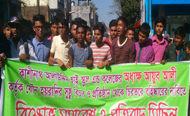 সমাবেশে শিক্ষার্থীরা বলেন, নানা প্রলোভন দেখিয়ে ছাত্রীদের যৌন হয়রানি করেন কাশীনাথ আলাউদ্দিন হাই স্কুল অ্যান্ড কলেজের অধ্যক্ষ আয়ুব আলী। ক্লাস চলাকালীন সময়েও তিনি শিক্ষার্থীদের সঙ্গে অশালীন আচরণ করেন।