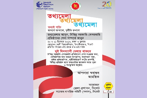 তথ্য অধিকার আইন-২০০৯ সম্পর্কে জনসচেতনতা সৃষ্টি এবং সরকারি-বেসরকারি বিভিন্ন প্রতিষ্ঠানের বিভিন্ন সেবা সম্পর্কে সাধারণ জনগণকে অবহিত করার লক্ষ্যে জেলা প্রশাসন, সিলেট এবং ট্রান্সপারেন্সি ইন্টারন্যাশনাল বাংলাদেশ (টিআইবি)’র অনুপ্রেরণায় গঠিত সচেতন নাগরিক কমিটি (সনাক), সিলেটের উদ্যোগে নগরীর রিকাবীবাজারস্থ মোহাম্মাদ আলী জিমনেশিয়ামে মঙ্গলবার (২০ ডিসেম্বর) ও বুধবার (২১ ডিসেম্বর) দু’দিনব্যাপী তথ্যমেলা সহ বিভিন্ন অনুষ্ঠানের আয়োজন করা হয়েছে।