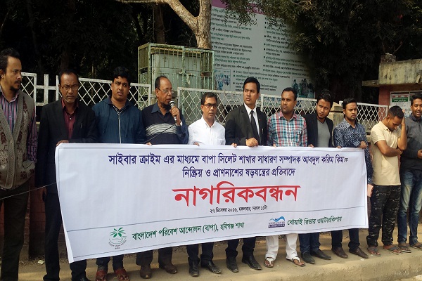 সাইবার ক্রাইমের মাধ্যমে বাংলাদেশ পরিবেশ আন্দোলন বাপা সিলেট শাখার সাধারণ সম্পাদক আব্দুল করিম কিমকে নিষ্ক্রিয় ও প্রাণনাশের ষড়যন্ত্রের প্রতিবাদে হবিগঞ্জে মানববন্ধন অনুষ্ঠিত হয়েছে।