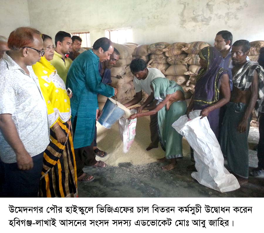 পবিত্র ঈদ উল ফিতরকে সামনে রেখে হবিগঞ্জ পৌরসভায় বিতরন করা হচ্ছে ভিজিএফের চাল। আজ মঙ্গলবার হবিগঞ্জ পৌর এলাকার ৫ টি কেন্দ্রে ভিজিএফ চাল বিতরন কর্মসুচী উদ্বোধন করেন হবিগঞ্জ-লাখাই আসনের সংসদ সদস্য এডভোকেট মোঃ আবু জাহির।