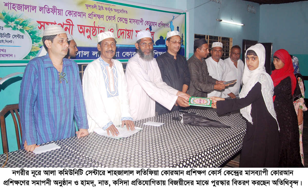 নগরীর নূরে আলা কমিউনিটি সেন্টারে শাহজালাল লতিফিয়া কোরআন প্রশিক্ষণ কোর্স কেন্দ্রের মাসব্যাপী কোরআন প্রশিক্ষণের সমাপনী অনুষ্ঠান ও হামদ্, নাত, কসিদা প্রতিযোগিতার পুরস্কার বিতরণী অনুষ্ঠান বুধবার দুপুরে অনুষ্ঠিত হয়।