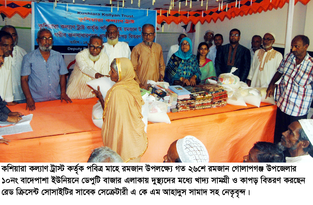 কুশিয়ারা কল্যাণ ট্রাস্ট কর্তৃক ও যুক্তরাজ্য প্রবাসী কুশিয়ারা কল্যাণ ট্রাস্টের সভাপতি মুকিত আহমদ, সাধারণ সম্পাদক আজিজুস সামাদ, কোষাধ্যক্ষ হাসান আহমদ ওয়েছ ও লোকমান উদ্দিন, এনাম উদ্দিন এবং সদস্যদের সার্বিক ব্যবস্থাপনায় পবিত্র মাহে রমজান উপলক্ষ্যে গত ২৬শে রমজান গোলাপগঞ্জ উপজেলার ১০নং বাদেপাশা ইউনিয়নে ডেপুটি বাজার এলাকায় গরীব, অসহায় ও দুস্থ্যদের মধ্যে খাদ্য সামগ্রী ও কাপড় বিতরণ করা হয়।