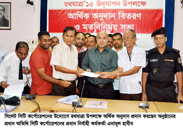 রথযাত্রা উপলক্ষে সিলেট সিটি কর্পোরেশনের উদ্যোগে দেবালয়কে অর্থিক অনুদান বিতরন ও এক মতবিনিময় সভা অনুষ্ঠিত হয়েছে। সিসিক সভা কক্ষে বৃহস্পতিবার সকালে রথযাত্রা উপলক্ষে উৎসবে অংশগ্রহণকারী ২১ দেবালয়কে সিলেট সিটি কর্পোরেশনের পক্ষ থেকে ৪ লক্ষ ২০ হাজার টাকা অর্থিক অনুদান প্রদান করা হয়।