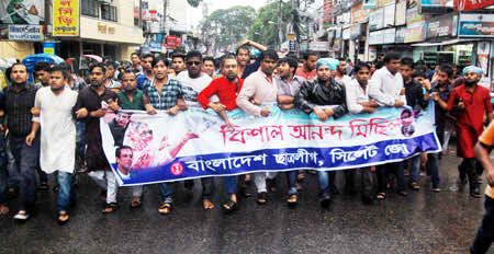 বাংলাদেশ ছাত্রলীগের ২৮তম জাতীয় সম্মেলনে সাইফুর রহমান সোহাগ কেন্দ্রীয় কমিটির সভাপতি এবং সিলেটের সন্তান এস এম জাকির হোসেন সাধারণ সম্পাদক নির্বাচিত হওয়ায় বাংলাদেশ ছাত্রলীগ সিলেট জেলা শাখা আনন্দ মিছিল করেছে। গতকাল শুক্রবার বিকালে বৃষ্টি উপেক্ষা করে জেলা ছাত্রলীগের নেতা কর্মী-সমর্থকদের মিছিলটি নগরীর কোর্ট পয়েন্ট থেকে শুরু হয়ে বিভিন্ন গুরুত্বপূর্ণ সড়ক প্রদক্ষিন শেষে সিলেট কেন্দ্রীয় শহীদ মিনারে সংক্ষিপ্ত সমাবেশের মধ্য দিয়ে সমাপ্ত হয়।