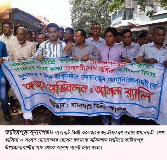 সুনামগঞ্জের তাহিরপুর উপজেলার বাদাঘাট ডিগ্রী কলেজকে জাতীয়করণ করায় প্রধানমন্ত্রী শেখ হাসিনা ও সুনামগঞ্জ-১ আসনের সংসদ ইঞ্জিনিয়ার মোয়াজ্জেম হোসেন রতনকে অভিনন্দন জানিয়ে আনন্দ মিছিল হয়েছে বাদাঘাট ডিগ্রী কলেজের ব্যানারে।