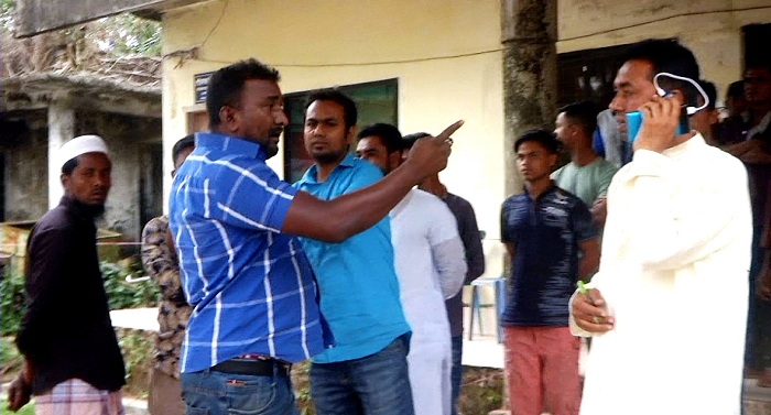 জাল ভোটে বাধা দেওয়ায় ভাইস চেয়ারম্যান প্রার্থী আব্দুল আহাদকে শাসাচ্ছেন যুবলীগ নেতা বাদশা। বিকেলে গোলাপগঞ্জের পৌরসভা কেন্দ্রে গিয়ে এ চিত্র দেখা যায়।