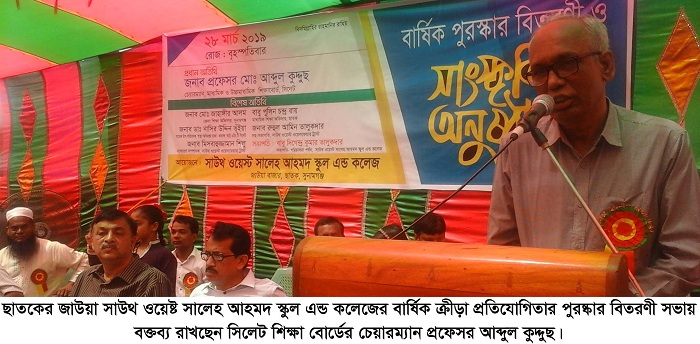 সাউথ ওয়েস্ট সালেহ আহমদ স্কুল এন্ড কলেজ পরিচালনা পর্ষদের সভাপতি দিগেন্দ্র কুমার তালুকদারের সভাপতিত্বে ও শিক্ষার্থী প্রমি দস্তিদার, বর্ণা সূত্র ধর এবং শাহরিয়ার হোসেন মাহিনের যৌথ উপস্থাপনায় অনুষ্ঠিত আলোচনা সভা, পুরষ্কার বিতরণী ও সাংস্কৃতিক অনুষ্ঠানে প্রধান অতিথি হিসেবে উপস্থিত ছিলেন, সিলেট শিক্ষা বোর্ডের চেয়ারম্যান (মাধ্যমিক ও উচ্চ মাধ্যমিক) প্রফেসর মোহাম্মদ আব্দুল কদ্দুছ।