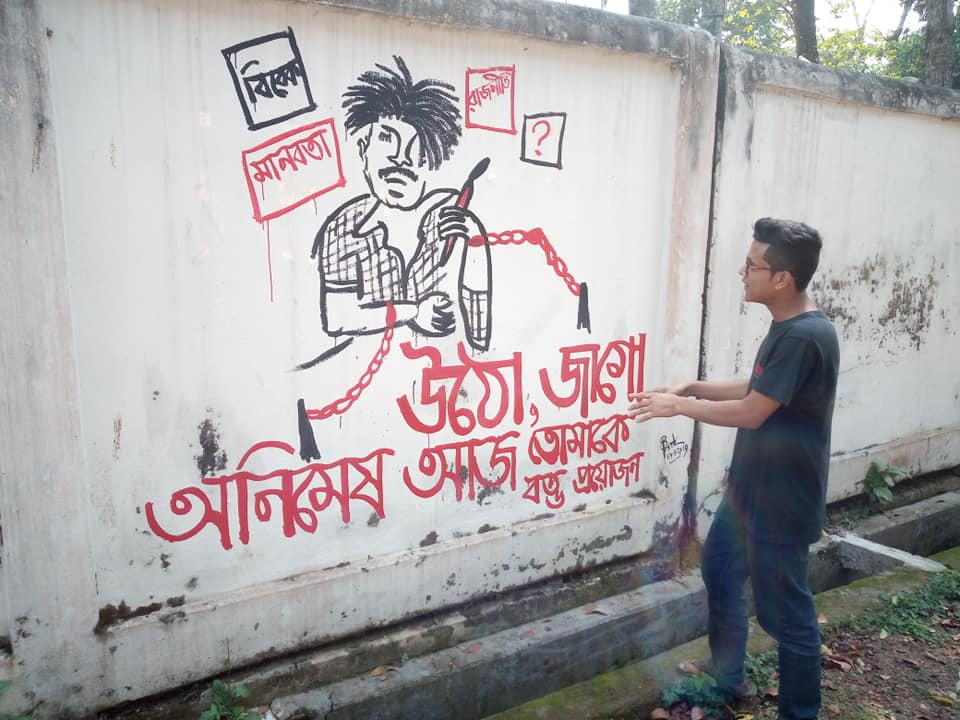 নিচে বড় করে লাল অক্ষরে লেখা ‘উঠো, জাগো/ অনিমেষ আজ তোমাকে বড্ড প্রয়োজন।’ দেয়াল চিত্রটির নিচের বাম কোণে ইংরেজিতে তারিখ লেখা ১৯/০৩/১৯। ইংরেজিতে একটি স্বাক্ষরও আছে।
