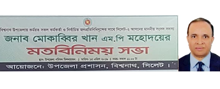 উপজেলা নির্বাহী কর্মকর্তা (ইউএনও)কে দিয়ে স্থানীয় সাংবাদিকদের বের করে দিয়ে শপথ নেওয়ার পর নিজ এলাকা সিলেটের বিশ্বনাথে প্রথম মতবিনিময় সভা করেছেন সিলেট-২ আসনের এমপি ও গণফোরাম নেতা মোকাব্বির খান। সোমবার সকালে উপজেলা প্রশাসন ও স্থানীয় জনপ্রতিনিধিদের সঙ্গে ছিল স্থানীয় এমপি মোকাব্বির খানের মতবিনিময়।
