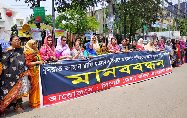 ফেনীর সোনাগাজীর মাদরাসাছাত্রী নুসরাত জাহান রাফিকে আগুনে পুড়িয়ে হত্যার প্রতিবাদে সিলেটে জেলা ও মহানগর মহিলা আওয়ামী লীগের নেতৃবৃন্দের পক্ষ থেকে বৃহস্পতিবার দুপুরে নগরীর চৌহাট্রাস্থ কেন্দ্রীয় শহীদ মিনার প্রাঙ্গনে মানববন্ধন করা হয়।