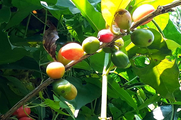 আঙ্গুরের মতো আকৃতির তার বাড়ির কফিগুলো অত্যন্ত চমৎকার রঙের। বর্তমানে দুটি গাছে প্রচুর পরিমাণে ফল ধরে পেকে গিয়ে লাল রং ছড়িয়েছে। লতানো গাছে চিকন ডালে ডালে ঝুলে থাকা কফিগুলো দেখতেও বেশ ভালো লাগে।