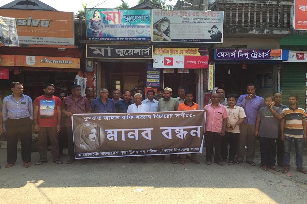 সুনামগঞ্জের দিরাইয়ে ফেনীর সোনাইগাজী মাদ্রাসার ছাত্রী নুসরাত জাহান রাফিকে আগুনে পুড়িয়ে হত্যায় জড়িতদের দৃষ্টান্তমূলক শাস্তির দাবিতে মানববন্ধন করা হয়েছে।