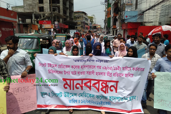 শিক্ষানবীশ (ইন্টার্ন) চিকিৎসককে ধর্ষণের হুমকি দেওয়ার ঘটনায় বিক্ষোভ মিছিল করেছে সিলেট উইমেন্স মেডিকেল কলেজের শিক্ষানবীশ চিকিৎসকরা। তাদের আন্দোলনে একাত্মতা পোষণ করেন সিলেট বিএমএ সভাপতি ডা. বদরুল হোসেন রোকন। এসময় তিনি ২৪ ঘন্টার ভেতরে অভিযুক্ত দক্ষিণ সুরমা উপজেলা ছাত্রলীগ সহসভাপতি সারোয়ার হোসেনকে গ্রেপ্তার না করলে বৃহৎ আকারের আন্দোলন করা ঘোষনা দেন।