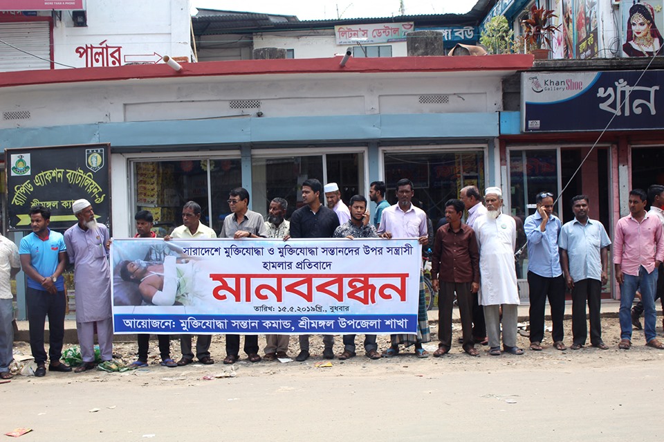 মৌলভীবাজারের শ্রীমঙ্গলে মুক্তিযোদ্ধার সন্তানের উপর হামলার প্রতিবাদে মানববন্ধন অনুষ্ঠিত হয়েছে।